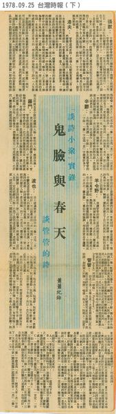| 標題: | 「談詩小聚」實錄 鬼臉與春天-談管管的詩(下) |