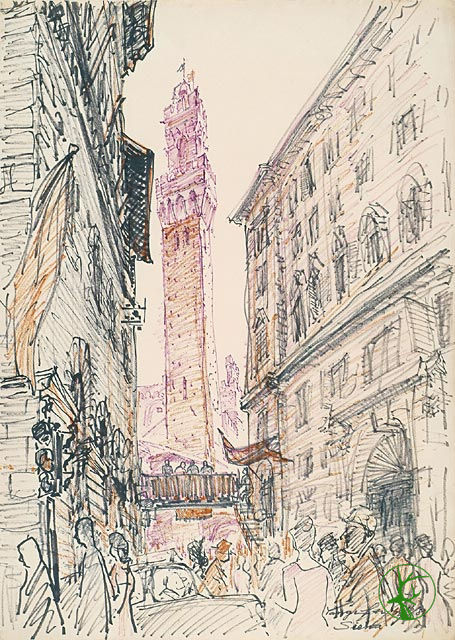| 摘要: | 西恩娜建在三座山丘上,是文藝復興時期之重要山城,此處洋溢濃厚的中世紀氣息,也是在13世紀時重要的商業城市,其著名的扇形廣場被譽為是義大利最美、最壯觀的廣場,而在每年的七月二日及八月十六日,西恩娜人皆會在廣場周圍舉行華麗的慶典兼賽馬大會,忠實重現中古時代的遺產,該市各區的居民選出在代表他們的馬匹和騎士,在廣場進行比賽,而贏得比賽的騎士被視為當地的英雄。作者以彩色簽字筆作畫,運用墨水幾乎用盡的簽字筆創造出如同蠟筆一般的溫潤質感,但仍保有簽字筆的俐落,畫面細膩且真實,前景以細膩簡潔又不繁瑣的線條勾勒出人物的形體特徵,並且將人山人海的場面處理的乾淨俐落,中景的建築則以紫色勾勒出輪廓線,再以深淺不一的線條塗滿於建築物,不僅序列出空間的遠近距離,更暗示了光線的明暗變化,並在天空處以留白處理,呈現西恩娜的幽雅與美麗。 |